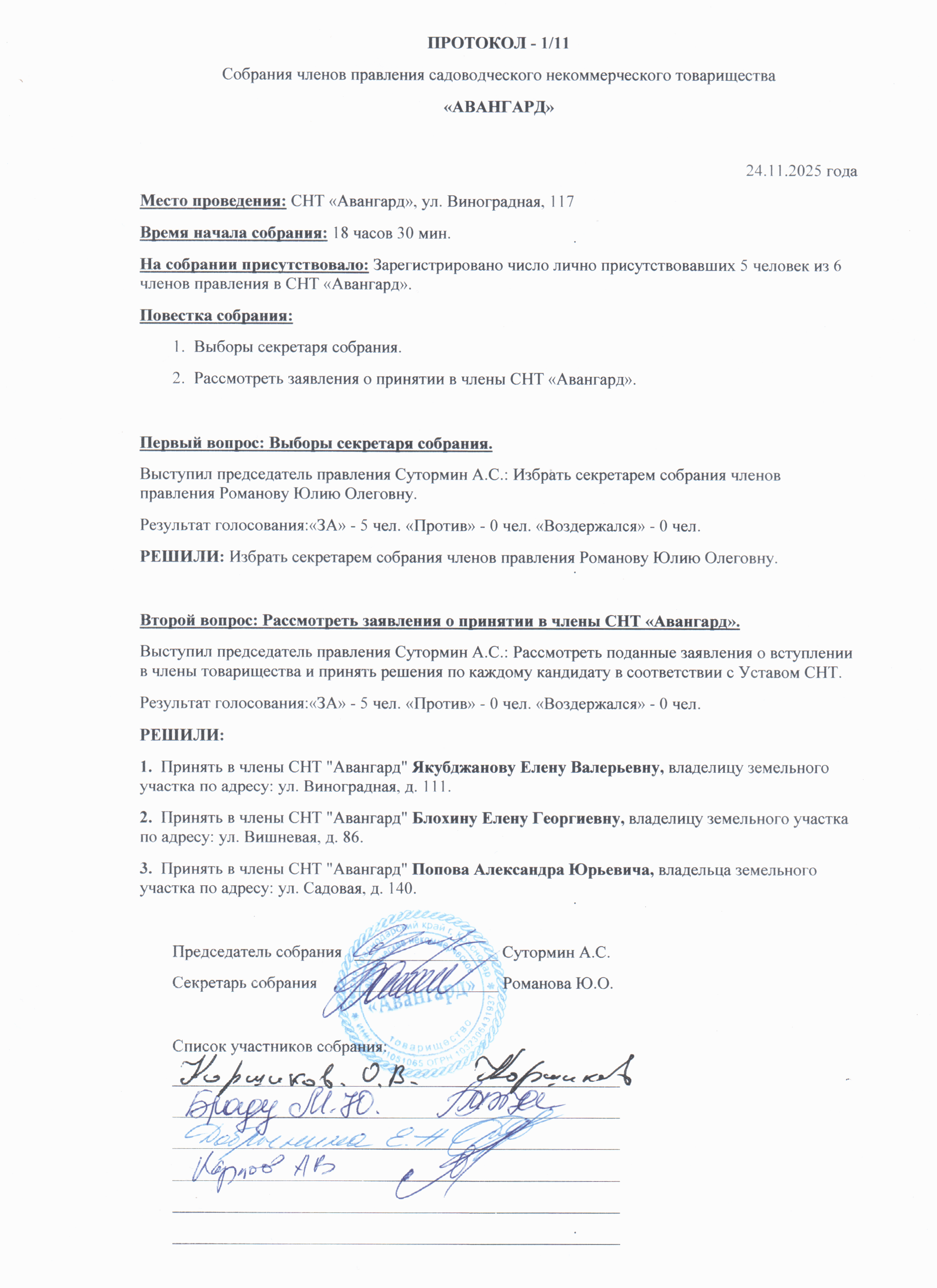 24 ноября 2025 года в 18:30 в СНТ "Авангард" по адресу: ул. Виноградная, 117, состоялось плановое заседание Правления товарищества.